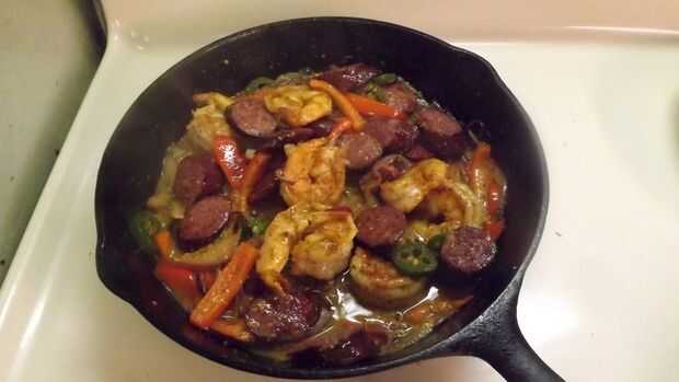 6. Volver a la salchicha y camarones a la sartén y mezcla y revuelva hasta que se caliente; tal vez de 2 minutos, (pero no cocine demasiado las gambas o se convertirá en resistente).