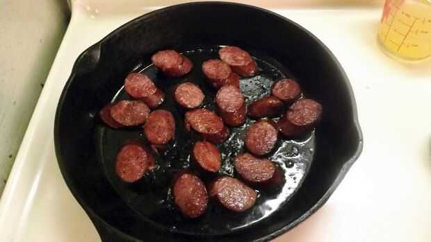 2. Cuando el aceite esté caliente, pero no fumador, lugar la salchicha en la sartén parte cortada hacia abajo y sofría hasta que se doren; voltear y dorar el otro lado (1 ó 2 minutos por cada lado) - Recuerde que está ya completamente cocido). Retirar de la sartén y reservar.