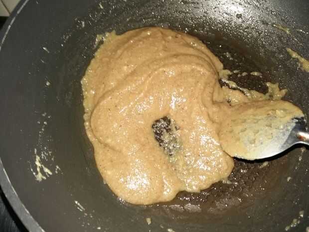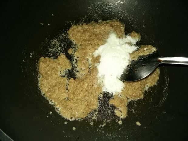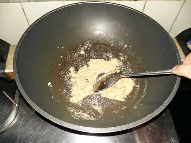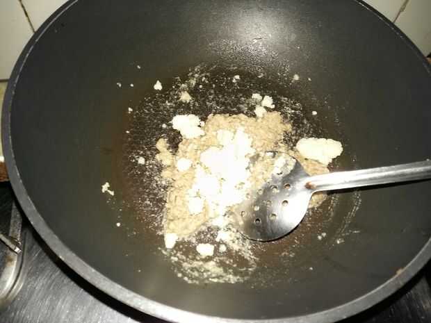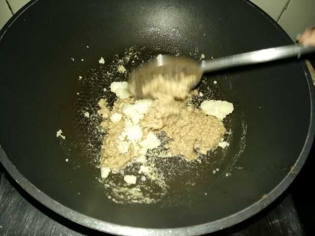 4. agregar leche entera deshidratada (khawa), mezclar bien y continuar saltear