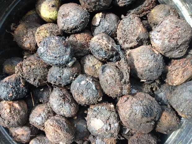 Repita los ciclos de vaciado y agregar agua limpia, aproximadamente cada treinta minutos. Usted notará la consistencia de los lodos se ha convertido en mucho más líquida, y las tuercas deben ser mucho más limpias. Puede repetir este proceso tantas veces como desee, aunque cuatro o cinco ciclos deberían ser suficientes. Usted sabrá cuando es el momento de cambiar el agua, pues sería muy oscuro o gruesa. Una manguera de jardín sería lo ideal para este paso, en lugar de tener que transportar agua hacia adelante y hacia atrás. Compara las imágenes de las tuercas después de solamente sus hojas quita, a las siguientes dos imágenes, que fueron llevadas después de cada enjuague y secado del ciclo.