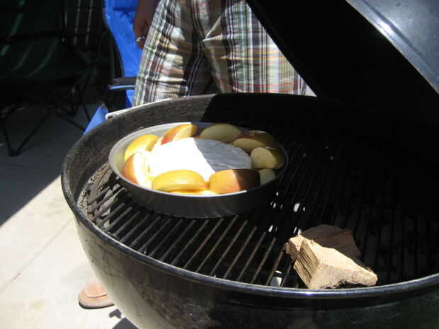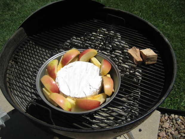 Coloque unos trozos de madera de la nuez en las brasas al arder y sabor queso/manzanas. También me gusta dejar un trozo en la parrilla sobre las brasas. La madera caliente no arder, pero huele maravillosamente. Busque luz whisps de humo. Si usted puede olerlo y apenas verlo, estás en la zona derecha. Demasiado humo abrumará el suave sabor del queso. Si estás fumando demasiado, abra la parrilla y mover la madera de los carbones con pinzas.
