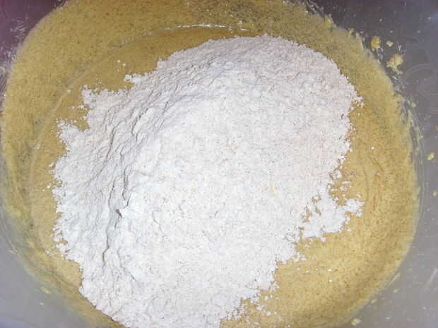 -En un recipiente aparte mezclar la harina, bicarbonato, polvo de hornear, canela y nuez moscada.