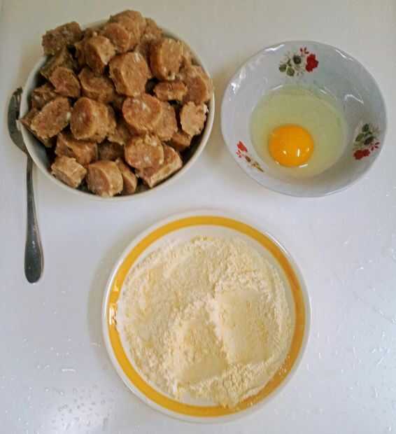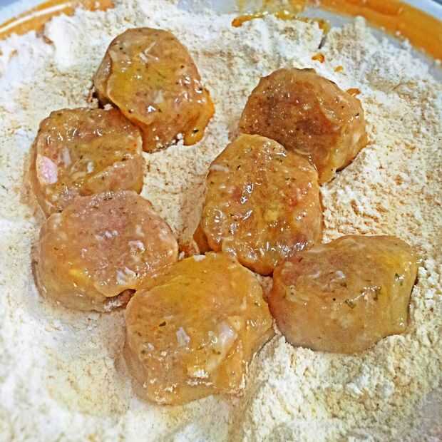 El proceso de la carne en harina, luego en huevo y las migas de la capa otra vez uniformemente creó una concha de oro crujiente agradable. Suavemente presionar las migas en la carne y los nuggets atrás de la placa.