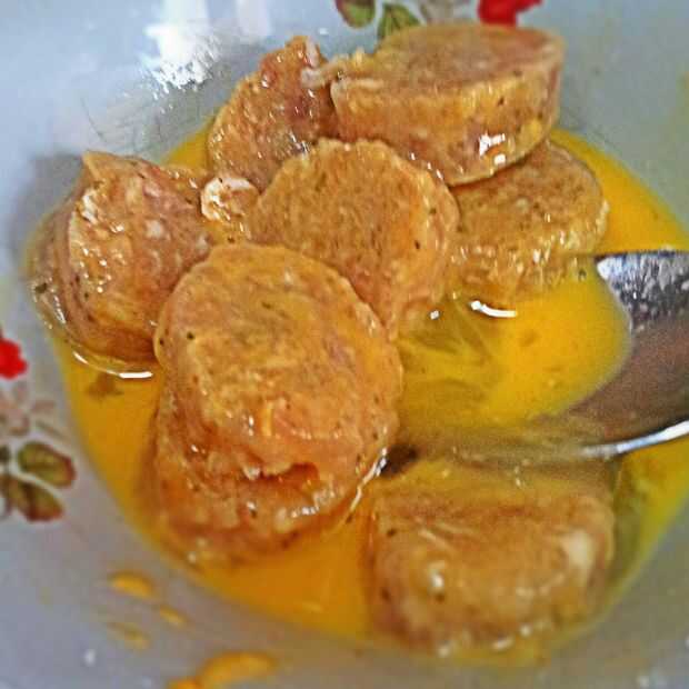 c. sumergir un pedazo de carne en la mezcla de huevo, luego capa de harina (trabajo en lotes).