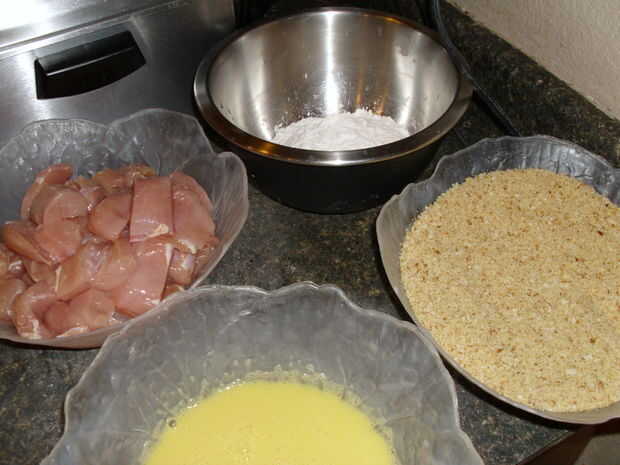 nuggets de pollo en salsa de Chile.Anís le da un sabor muy especial a este plato pero necesitas aplastar para el mejor resultado.El ingrediente secreto: anís.Paso 1: ingredientes los ingredientes:pechugas de pollo 500 grharina de maíz2 huevosPankosal
