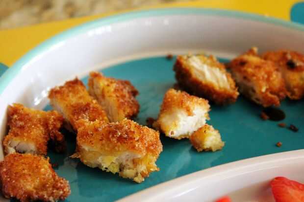 Con unas tijeras de cocina, cortar el pollo en 1-2 pulgadas nugget tamaño de piezas. Ponga a un lado.