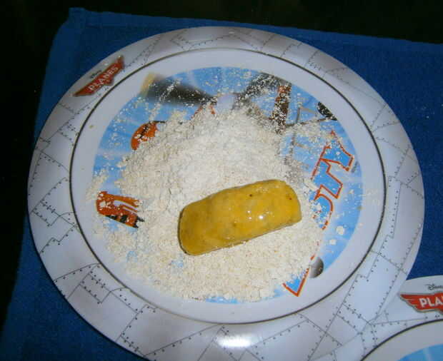 Sumerja las croquetas en huevo y dejar que el flujo de huevo exceso apagado hacia abajo. Cubrir con avena. Mantenga listo para freír.