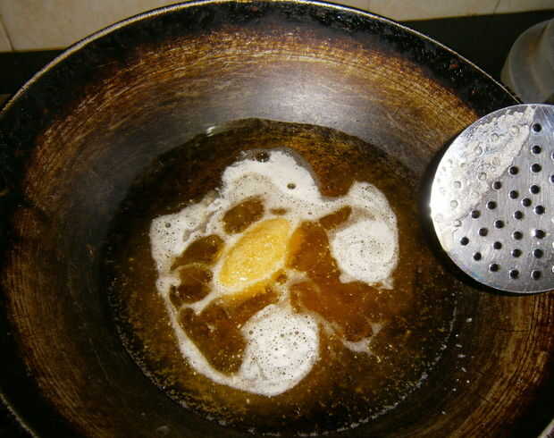 Calentar el aceite. Cuando el aceite esté caliente añadir las pepitas para freír. Cuando un lado ha vuelto marrón dorado, voltee y fría el otro lado.