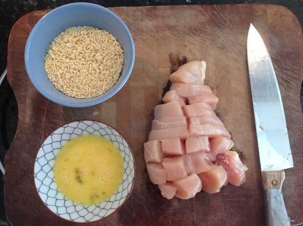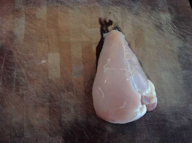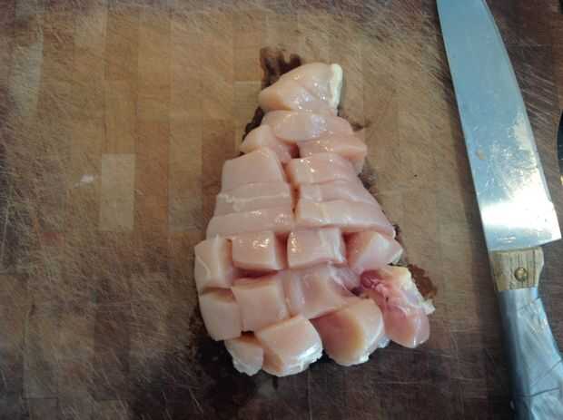 1. Tome la pechuga de pollo y un cuchillo (que han roto y han sido reparados por cinta son finas) cortar en mordedura de tamaño piezas como en la segunda foto.