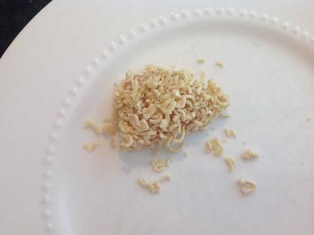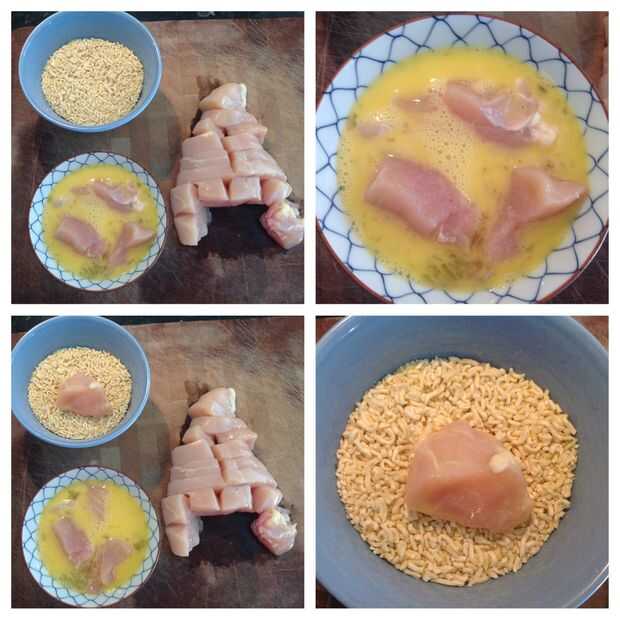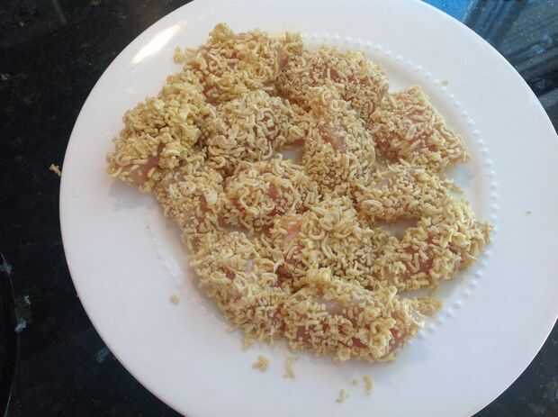 Consejo: Una mano hacer las cosas mojadas (cubriendo el pollo con el huevo) y la otra mano la materia seca (cubriendo el pollo con tallarines de ramen, colocación de nuggets en un plato).