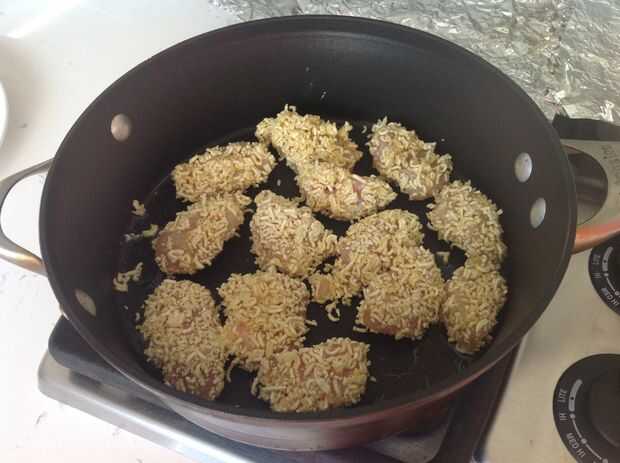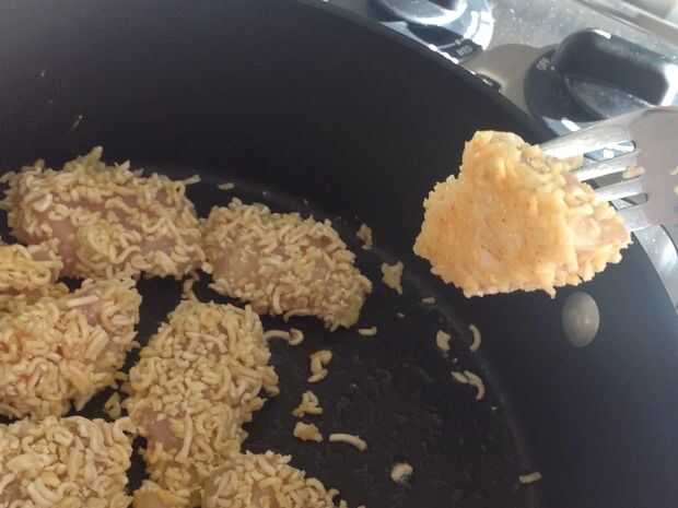2. Coloque todos los nuggets en una capa uniforme sobre la bandeja. No te preocupes si se cae de la capa de fideos ramen, usted puede recogerlos más adelante.