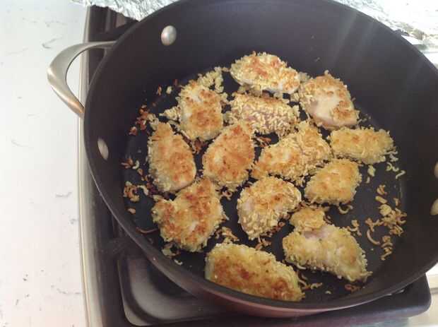 4. una vez que los nuggets son dorados como en la última foto, darles la vuelta para que pueda cocinar el otro lado. Una vez que usted puede ver que el otro lado también es de oro, quitar las pepitas de la sartén y transferirlas a una placa (o sólo comen fuera de la sartén, menos amirite platos?)