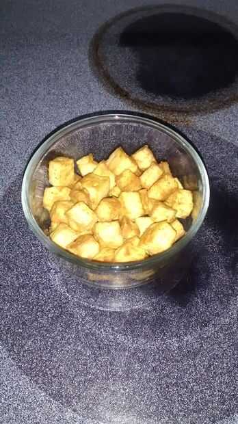 Cuando el horno a 450° F y el tofu es listo poner el tofu en el horno. uso de 15 minutos la espátula girar el tofu, o por lo menos mezclarlo y ponerlo de nuevo en otro tiempo Total de 15 minutos en el horno es 30 minutos pero puede variar dependiendo de qué desea consistencia y también he encontrado el tipo de tofu. Las esquinas de los cubos deben comenzar muy marrón, pero no quemada. Sacar la bandeja para hornear galletas (utilice una almohadilla caliente) y dejarlo a sentarse.
