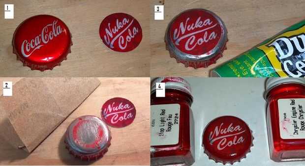 Tomar la tapa de Coca Cola y enderezarlo lo mejor pueda. Luego lijar toda la superficie con lija de 220. Pegar la etiqueta en su lugar, asegurándose de que esté centrado. Una vez el pegamento secado pinté el resto de la tapa con pintura de modelo. Mezclé los dos colores "Parar rojo de luz" y "Chrysler motor rojo" para obtener un rojo del mismo color de la etiqueta.