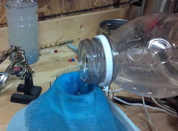 Cuando tengas la mezcla apenas a la derecha, van a ser grandes piezas de pintura flotando en ella. Tome una toalla o algo similar y lo coloca en la parte superior de la botella vacía como un filtro. Vierta lentamente la mezcla a través del filtro quitando todos los trozos grandes de pintura. El líquido está listo para ser vertido en la botella del coque. Recomiendo usar un pequeño embudo para esto.