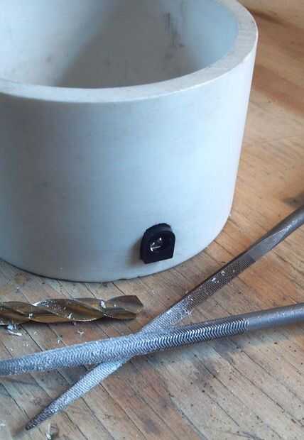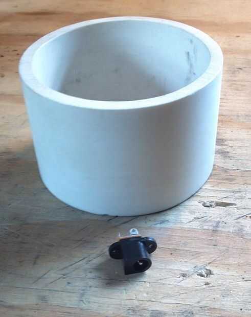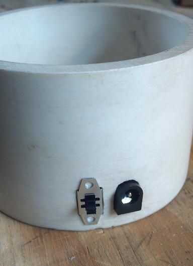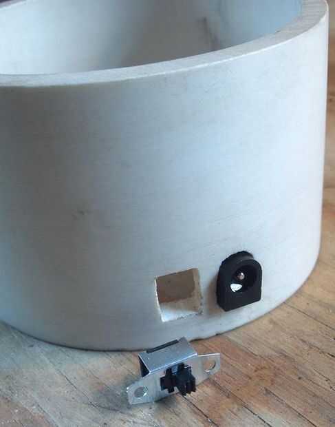 Encontrar el lugar en el PVC que quiere ser la parte de atrás. Broca para taladro de unos 5/8" del taladro inferior un agujero con un 1/4". Usando una lima redonda pequeña y un pequeño archivo de cuadrado, forma el agujero para encajar al conector de alimentación DC. Derecho al lado de eso hacer lo mismo con el interruptor submini.