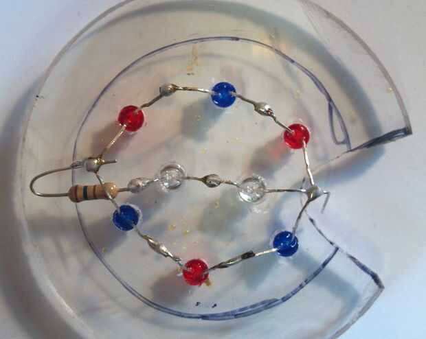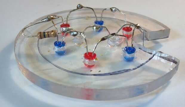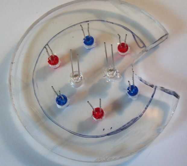 Insertar los LEDs en los agujeros, alternando rojo y azul en el exterior y los LEDs ULTRAVIOLETA en el centro. Debe encajar perfectamente sin ninguÌ n pegamento. Tenga en cuenta las posiciones de los cables conduce por lo que puede doblar fácilmente para soldarlos juntos. Los cables largos son positivos y los cortos son negativos.