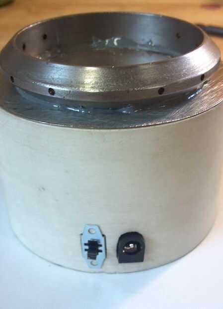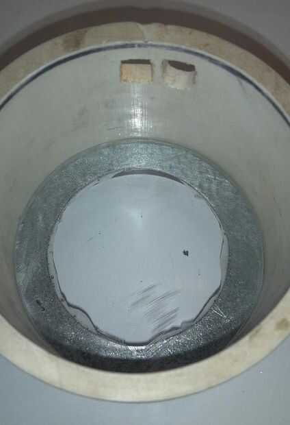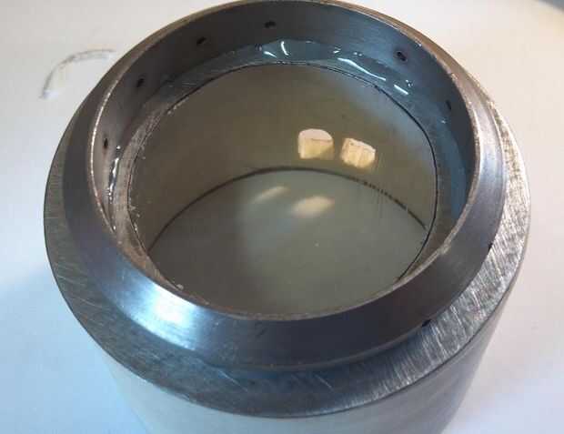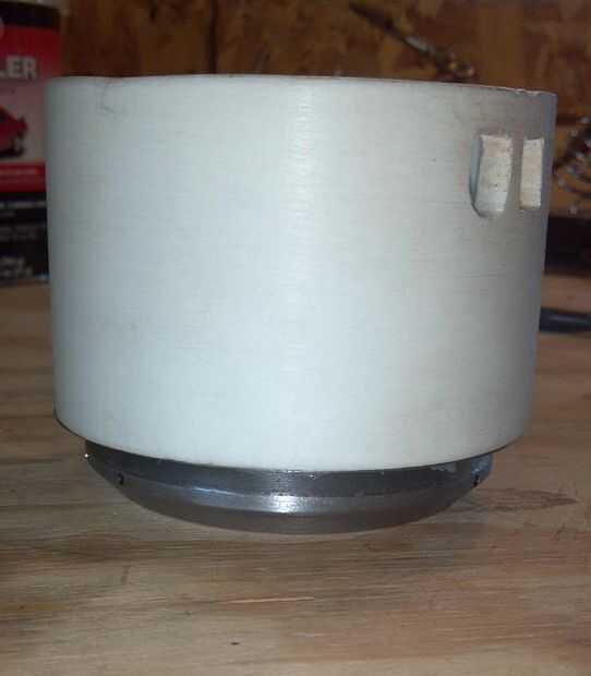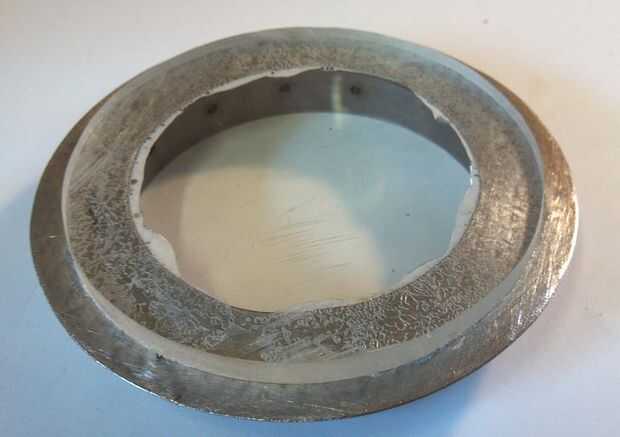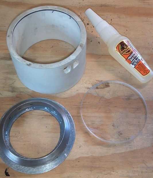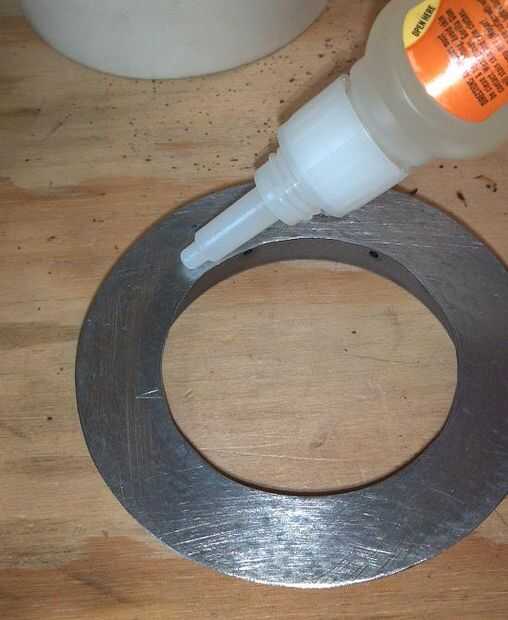 Voltee el ensamblaje de junta y centro el PVC boca abajo de eso. Poner una capa delgada de pegamento en el interior borde del anillo de metal de hoja. Este pegamento para vidrio acrílico no es el PVC.