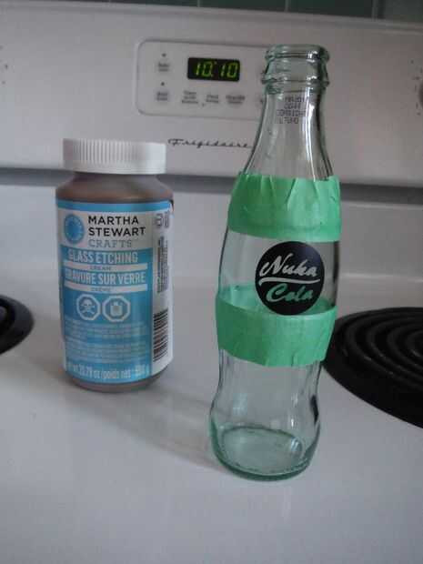 Hay un montón de etiquetas de Nuka-Cola disponibles en línea si desea agregar una etiqueta de papel impresa (como esta), pero quería que las botellas enteras a brillar, así que decidí grabar la etiqueta en el vidrio.