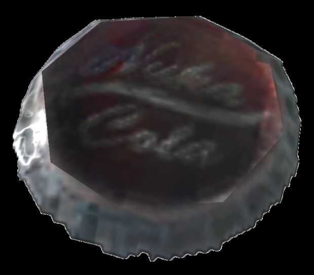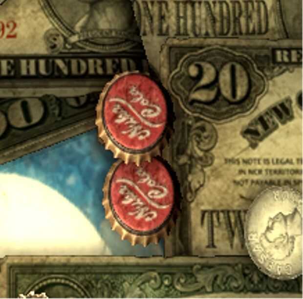 Ahora un pequeño debate sobre el esquema de color. La mejor imagen que podemos conseguir de cualquiera de los juegos es la que he añadido aquí. Su una interfaz de apuesta de la caravana de New Vegas. Estas tapas muestran una como casquillo de latón base mientras que la etiqueta de Nuka Cola tiene un contorno negro.