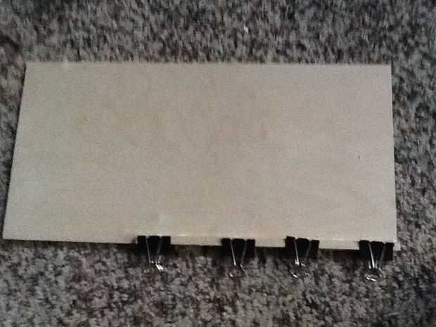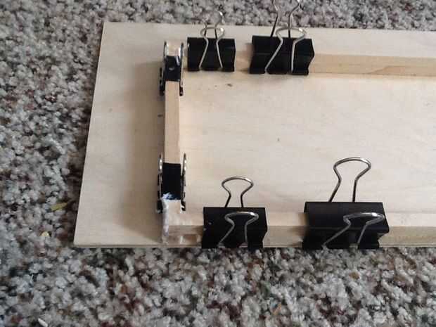 Como medir tu panel de plexiglás y determina el grosor del marco y el tipo si el forro (tornillo, magnético, o pegamento) y el respaldo para su proyecto. Yo empezaría con el marco con madera pegamento y binder clips presionado para que el pegamento se seque. Note que en la segunda foto dejó un pequeño agujero, y usar ese agujero rosca en mi luz de la cuerda que será el siguiente paso. Cuando el pegamento esté seco, la arena que le dan un aspecto liso y pintar el marco de su elección de color.