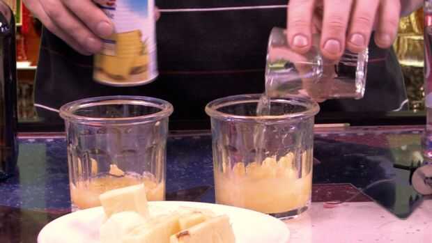 A continuación añadir 1/2 onza o Vodka y 1/2 oz de jugo de piña. Mezclar con un palillo de swizzle o bar la cuchara.