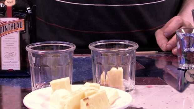 Muchas personas mantienen que la piña es un afrodisíaco, razón por la cual nuestro Flirtini comienza con dos trozos frescos de piña en el fondo de un vaso vaso.