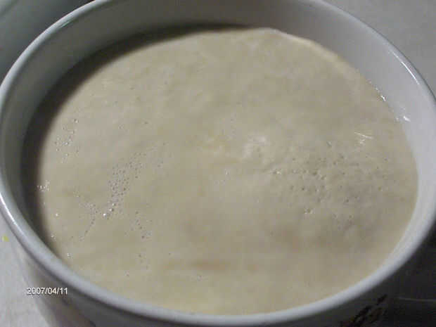 Disolver la levadura en agua tibia, dejar reposar hasta que quede espumosa. Mientras tanto en un recipiente aparte, mezclar el azúcar y harina de pan bien.