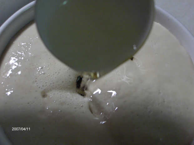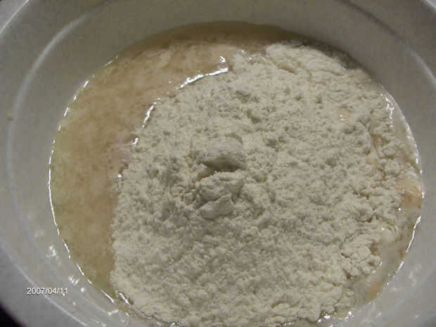 Cuando el agua ya espumosa mezcla de mezcla de sal y aceite, mezclar bien. Mezcle harina una taza a la vez.
