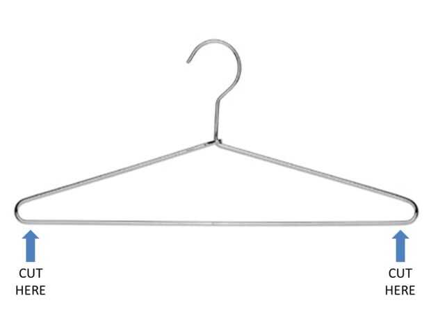 - Cortar una longitud recta del alambre de la percha - la parte recta larga en la parte inferior de la suspensión es perfecta (ver sexta foto). Si el gancho de alambre no es brillante, utilice lana de acero para quitar la capa - esto se asegurará de que la suspensión conduce la electricidad para el proceso de recubrimiento de polvo.