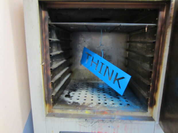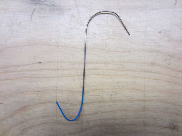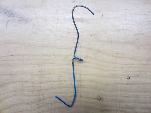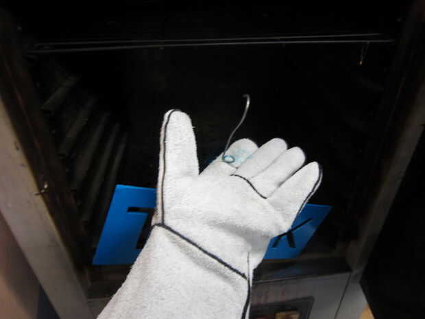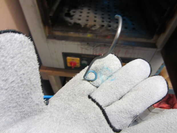 El problema no era que yo soy torpe pero con el gancho de metal estaba usando para colgar mi trabajo. Yo estaba usando un trozo de alambre en forma de una "S" (ver segunda foto). Es muy difícil de agarrar y sujetar una longitud recta del alambre con guantes de cuero grueso (el horno está caliente, cuando usted pone su obra y el metal de recubrimiento en polvo es 350 grados F cuando sale del horno). Es especialmente difícil cuando el trabajo es pesado (el signo creo que pesa un par de libras).