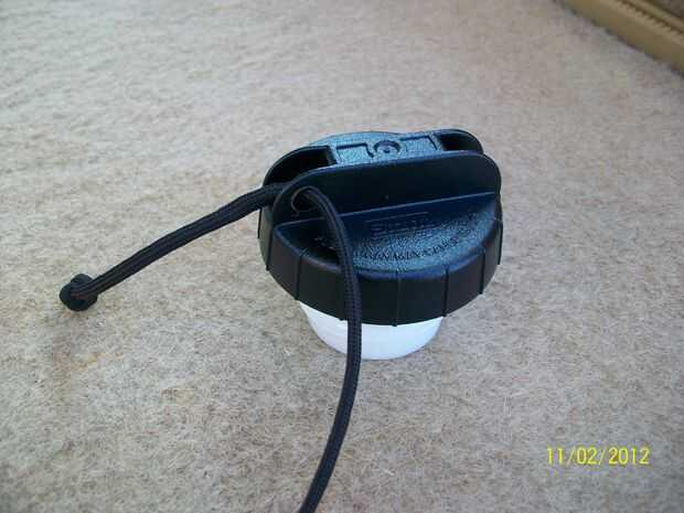 Después de perforar el agujero me encontré un pedazo de paracord a través del orificio y un nudo poco agradable. Tire firmemente y entonces puede fundir el extremo del cable. Para la siguiente parte necesitará buscar un lugar conectar el otro extremo de la paracord demasiado. Tuve una opción hacer el agujero en la puerta del combustible o el soporte para el tubo de llenado. Opté por colocar en el soporte del tubo de relleno. Haga otro nudo y cortar ningún cable adicional si usted tiene cualquiera.