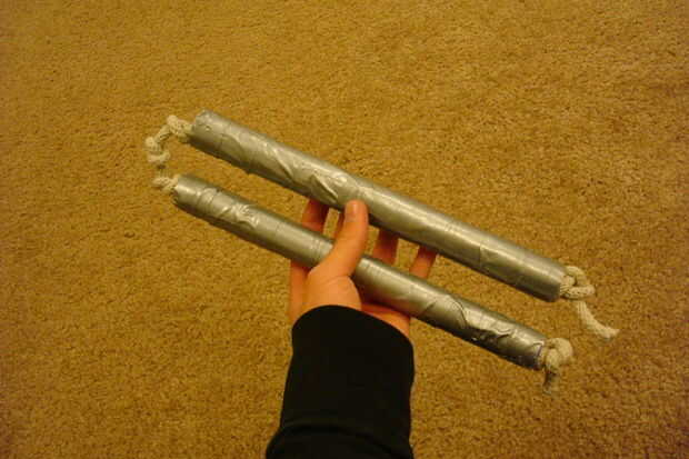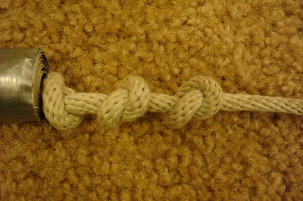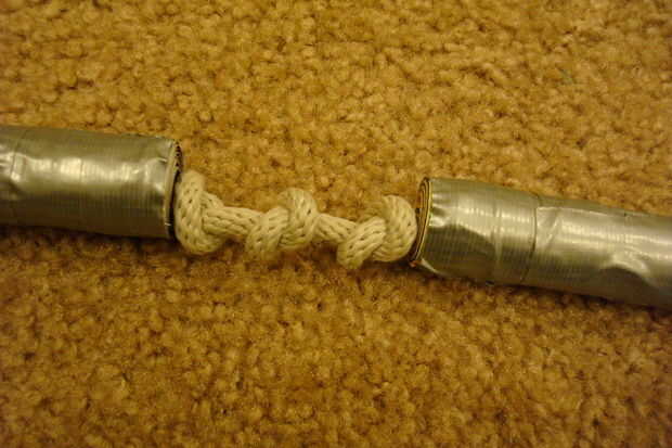 Haga dos nudos solo más justo al lado de la otra, dentro de una media pulgada o menos. poner la otra revista en la cuerda y atar a una abuela doble abrazos al final del mismo. Corte la cuerda extra y listo.