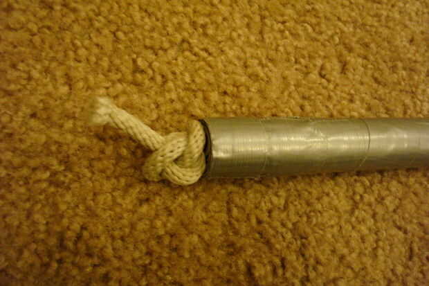 Pase la cuerda por el agujero que debían para salir en la revista hasta que sale del otro lado. Si el orificio es demasiado pequeño puede utilizar ésos Get cool la cuerda a través de trucos usted debe saber, como conectar un peso hasta el final para ayudar a tirar de él a través de, o si se puede llegar, pinzas de punta de la aguja. De todos modos, pasar la cuerda al otro lado y un nudo doble granny en el final de la misma y tire de él hasta el final de la revista por lo que es apretado. sólo un nudo simple sobre el lado largo de la cuerda, abrazando también a la revista.