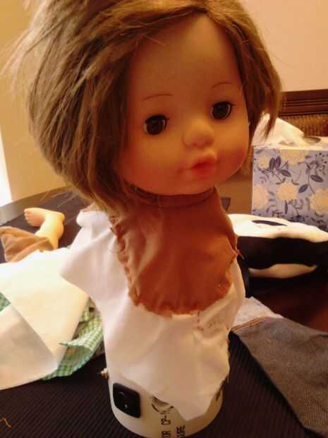 1. tenemos que extender a la tela alrededor de la cabeza de modo que se extiende en la ropa cuando le vestimos. Corte una tira de tela (yo usé una vieja funda de almohada) y coser sobre el material existente