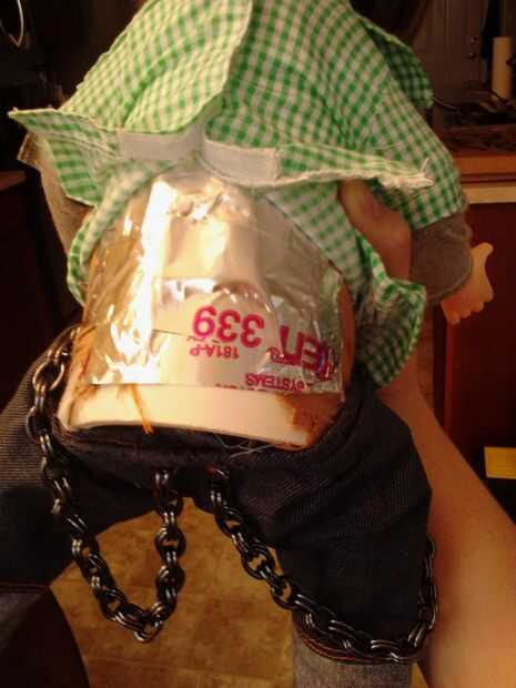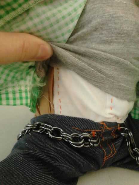 6. Vestido de la muñeca. La ropa debe ajustarse perfectamente alrededor del tubo. Cosí las cadenas a los pantalones de mi muñeca a la cubierta lo pero que por supuesto es totalmente opcional. Es un poco dificil que levantarse los pantalones alrededor de la tubería pero encajan sin alteraciones.