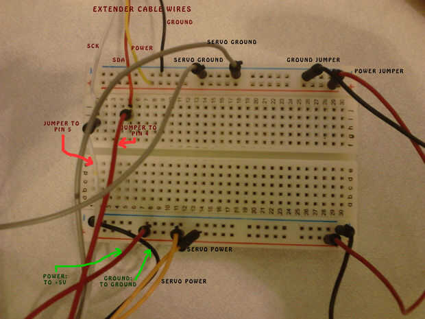 2. Utilice el tablero de pan para alimentar los servos y el nunchuk. Usted puede atar con alambre la placa de pan cómo siempre funciona mejor para usted, pero yo he proporcionado mi set de cableado para arriba para su referencia. Aquí hay un video en el pan básico de junta para los nuevo en esto: