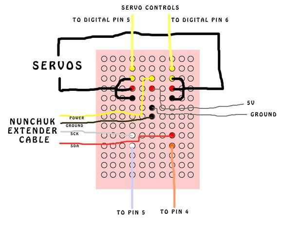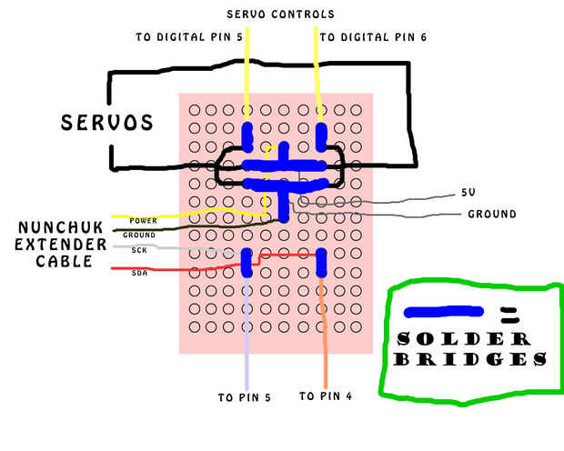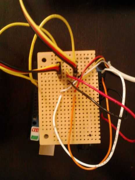 3. siga su plan y soldar los cables a la Junta. Tienes 6 cables que salen de la placa que se enchufa en el Arduino. Esta voluntad que requiere tender un puente sobre. En el tablero de pan, las filas fueron conectadas como vio en el video, pero en este foro no lo son, cualquiera de los componentes que necesitan tener una conexión a necesitar salvar. Esto significa que usar una línea de soldadura para conectar los componentes.