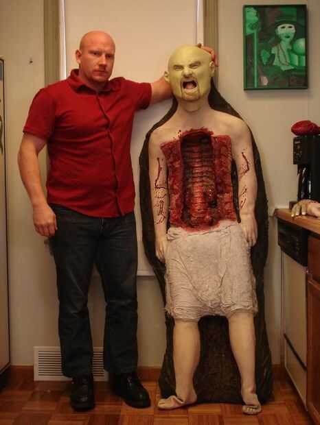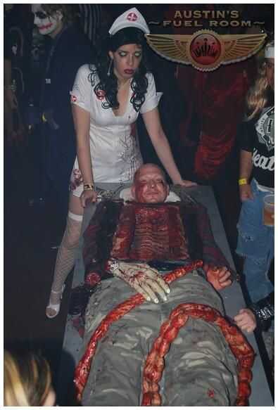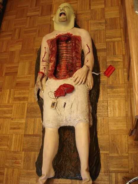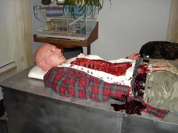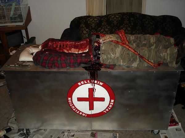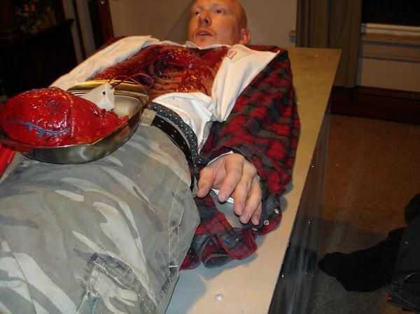 this is my creation. Vi esta cavidad de pecho maravilloso en un apoyo de césped y pensé que sólo tenía que hacerla en un traje. Iba a ser un doctor loco con mi wacked enfermera y un rasgado aparte patente en un gurnee. iba a ser 100% apoyo con todo lo que mueve los controles de la manija es por eso la máscara en las primeras fotos, pero mi amiga dijo lo de no parece parte de mi traje porque realmente no estaba conectada a mí. me tiene pensando y no quería tomar esa oportunidad así que raspa al doctor loco y destripado patente con aves a enfermera. en su lugar iba a ser la patente aparte ripeada de aves a enfermera y eso es cómo la idea vino a mí. el derecho de pie patadas por patear un control por debajo de lo gurnee, hay un corazón cortado en un plato de acero inoxidable que vencer a vida como (se mueve de un lado luego el otro) también chorros de sangre por control debajo de gurnee, allí está la mano cortada que se mueve también por control por debajo de lo gurnee. y tiene un sistema de nebulización el la niebla se dispersa uniformemente fuera de la parte inferior de los lados de lo gurnee. una de mis manos están arriba y la otra debajo a opperate los controles. no necesita ser empujado cualquiera. se puede mover estilo de fred flinestone. He ganado miles de dólares con él y piensan que soy un profesional agente/FX