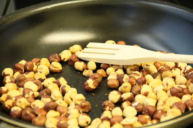 a fuego medio, seco asado sus avellanas durante unos 10-15 minutos. Las tuercas deben olor tostadas, no quemado.
