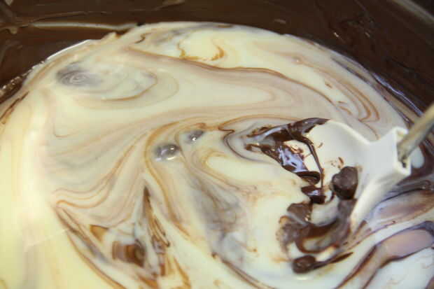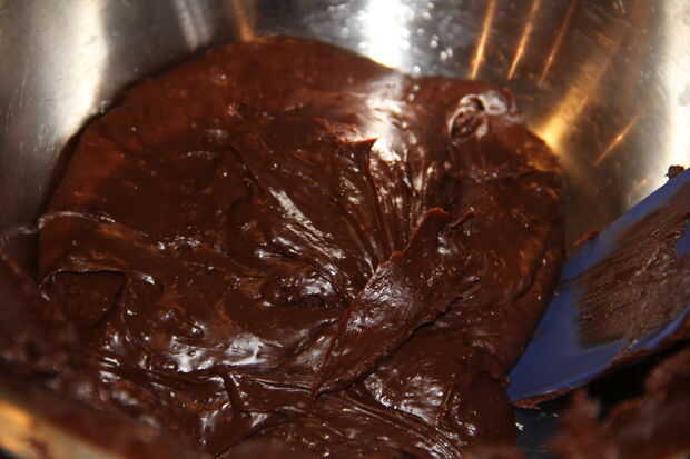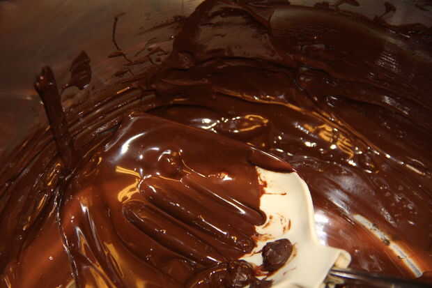 En baño María, derretir el chocolate hasta que quede suave y derrita. Si lo desea, puede Agregar una pizca de sal aquí. Retirar del fuego y vierta en un tazón.