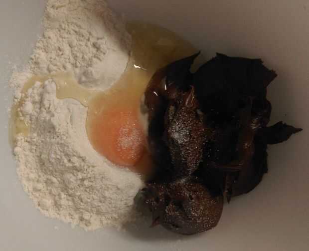 Poner 1 huevo, 1 taza de harina, 1 taza de Nutella, 1 cucharadita de azúcar blanco en un recipiente. No tiene que ser muy exacto, que es maravilloso si eres un soporte terrible como yo.