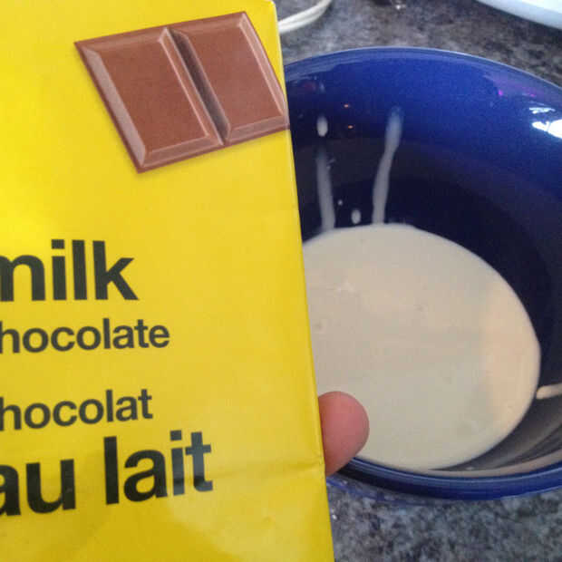 Calentar la crema de leche en el microondas durante 50 segundos después agregue chocolate roto