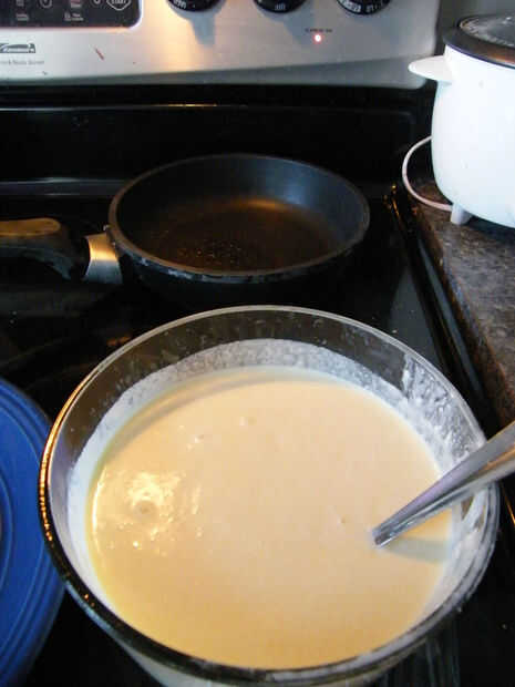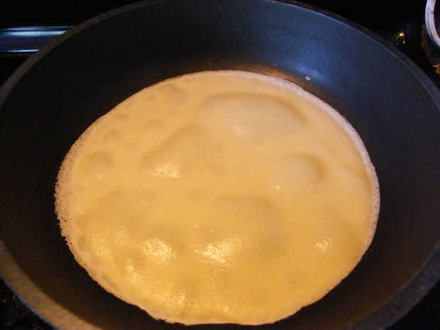 Calentar sartén antiadherente, verter un cazo (pequeño) la masa y cocinar la crepe hasta que infle y se dore un poco marrón