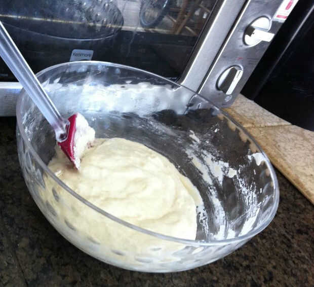 Luego, agregue lentamente los ingredientes secos a los ingredientes húmedos hasta que totalmente incorporado. Mezcle no. Use una espátula de goma y pliegue pliegues ingredientes aproximadamente 40. Añadir el extracto de almendra y mezclar una vez más.