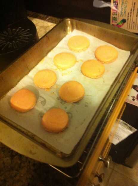Hornear el macaron cáscaras durante 20 minutos, girando alrededor, a mitad de camino. Si ves el craqueo superior, baje el fuego. El macarrón no debe agrietarse en la parte superior y debe dar que "corona" mira a los lados. La parte superior debe buscar lisa. Si sus cáscaras macaron parecen no son grietas, ni no consigue liso o dando la apariencia de "corona", una de las razones podría ser porque usted overbeat-ed los huevos. Tomar sus cáscaras en el papel de pergamino y déjelo reposar fresco 10-15 minutos.