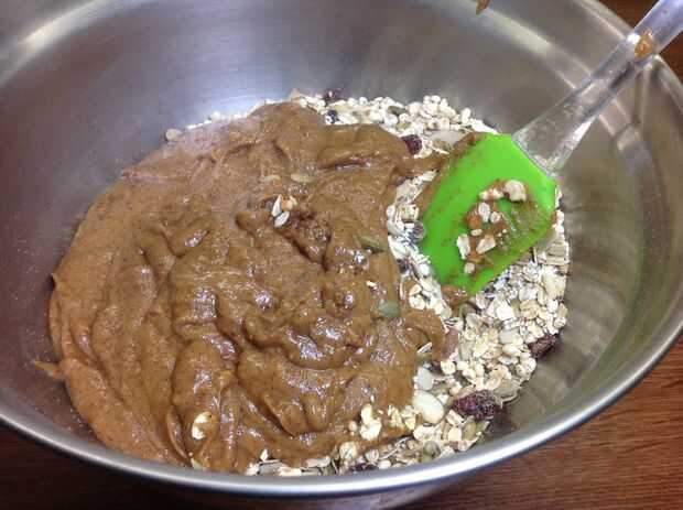 Combinar los ingredientes secos y húmedos y mezclar para distribuir uniformemente los ingredientes.