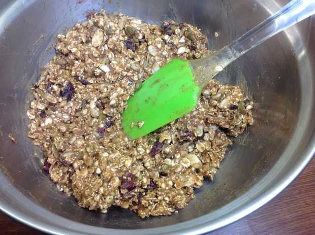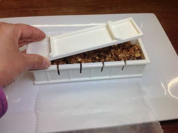 Cortar 5 cuadrados de papel de pergamino lo suficientemente grande para envolver el sushi molde , lugar de su fábrica de sushi en el papel de pergamino, llenarlo con la granola, presione firmemente para formar una barra. Coloque las barras en nevera para establecer.