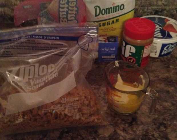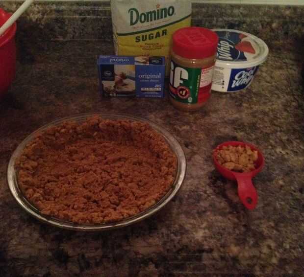 este no pastel de mantequilla de maní horneado es fácil de hacer y gustos impresionantes!Paso 1: ingredientes 1) 1 taza de mantequilla de maní y 2 cucharadas 2) 12 onzas de cool whip y 3 tazas de relleno 3) 1 paquete de queso crema 4) 1/2 taza de vas