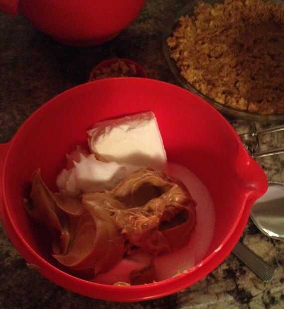 este no pastel de mantequilla de maní horneado es fácil de hacer y gustos impresionantes!Paso 1: ingredientes 1) 1 taza de mantequilla de maní y 2 cucharadas 2) 12 onzas de cool whip y 3 tazas de relleno 3) 1 paquete de queso crema 4) 1/2 taza de vas